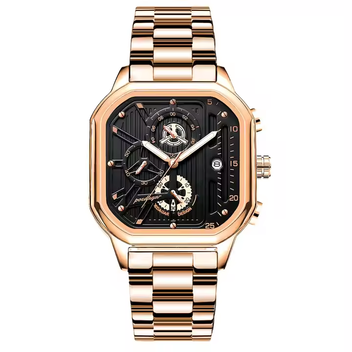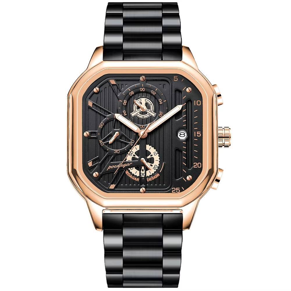 🔍 Design unique : Boîtier rectangulaire avec mécanisme visible et sous-cadrans stylisés.