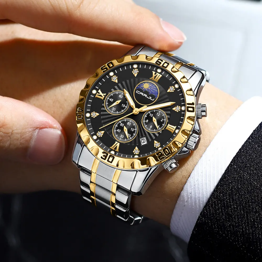 Fonction chronographe, affichage de la date, phase lunaire décorative… chaque détail est pensé pour allier fonctionnalité et prestige.